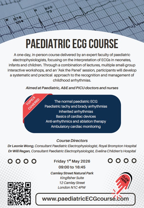 A one-day, in-person course focusing on the interpretation of ECGs in neonates, infants and children. Basic ECG knowledge is required to gain the most from this day. The course is limited to 60 participants.