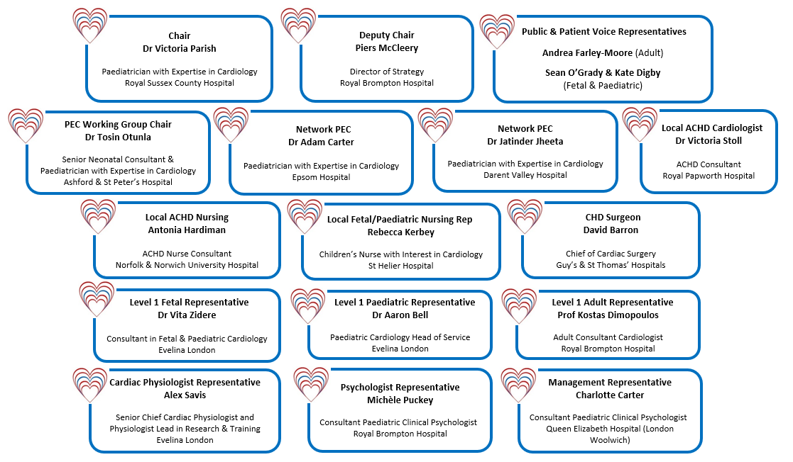 The Lifelong CHD Network has a management team that works with a wide range of stakeholders from across its geography. It is hosted by Guy’s and St. Thomas’ NHS Foundation Trust and funded by NHS England. It is governed by the Network Board, which has oversight of its work.
